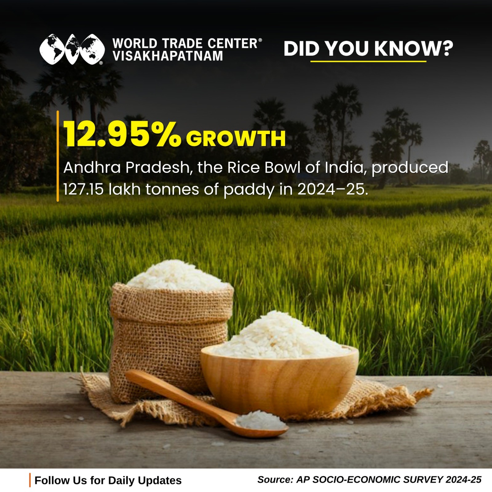 | | | With paddy production reaching 127.15 lakh tonnes in 2024–25, the state registered a remarkable 12.95% growth, reaffirming its title as the Rice Bowl of India, known for its fertile Krishna–Godavari delta. This growth reflects strengthened irrigation, farmer-centric initiatives, and resilient agri practices driving rural prosperity. | | |