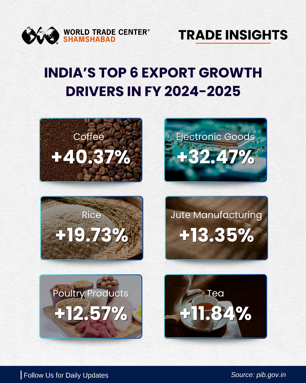 | | | India’s export story continued to shine in FY 2024–25, with several sectors recording remarkable growth and strengthening the country’s global trade presence. Coffee led the surge with +40.37%, followed by Electronic Goods at +32.47%, Rice at +19.73%, Jute Manufacturing (incl. Floor Coverage) at +13.35%, Meat, Dairy & Poultry Products at +12.57%, and Tea at +11.84%. Together, these sectors highlight India’s growing export competitiveness - blending agricultural excellence with technological innovation to power global demand. | | |