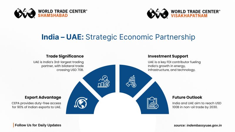 | | | India and the UAE continue to strengthen their strategic economic partnership, with bilateral trade crossing ๐๐๐ ๐๐๐, making the UAE Indiaโs ๐๐ซ๐ ๐ฅ๐๐ซ๐ ๐๐ฌ๐ญ trading partner. Backed by CEPA, ๐๐% of Indian exports enjoy duty-free access. Looking ahead, both nations are set to reach ๐๐๐ ๐๐๐๐ in non-oil trade by 2030 - a testament to this thriving collaboration. | | |