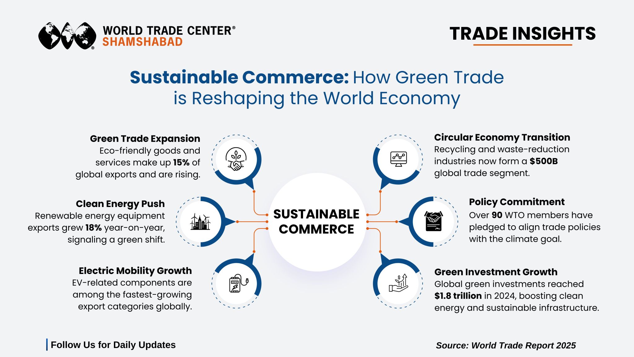 | | | Sustainable commerce is transforming the world economy with a major focus on green trade and eco-friendly innovation. The latest insights reveal that green products now make up 15% of global exports, renewable energy equipment exports grew 18% year-on-year, and electric vehicle components are leading among the fastest-growing export categories worldwide. The circular economy has created a $500 billion trade segment, while global green investments surged to $1.8 trillion in 2024. Additionally, over 90 WTO members have committed to climate-aligned trade policies, reflecting a strong policy shift toward sustainability. | | |