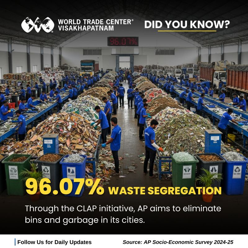| | | Andhra Pradesh has achieved an impressive 96.07% waste segregation through its innovative CLAP initiative, setting a benchmark for sustainable urban living. By working towards eliminating bins and garbage from cities, the state is not only ensuring cleaner environments but also building a replicable model of urban sustainability for India and beyond. This initiative showcases how policy, community engagement, and technology can converge to redefine waste management. | | |