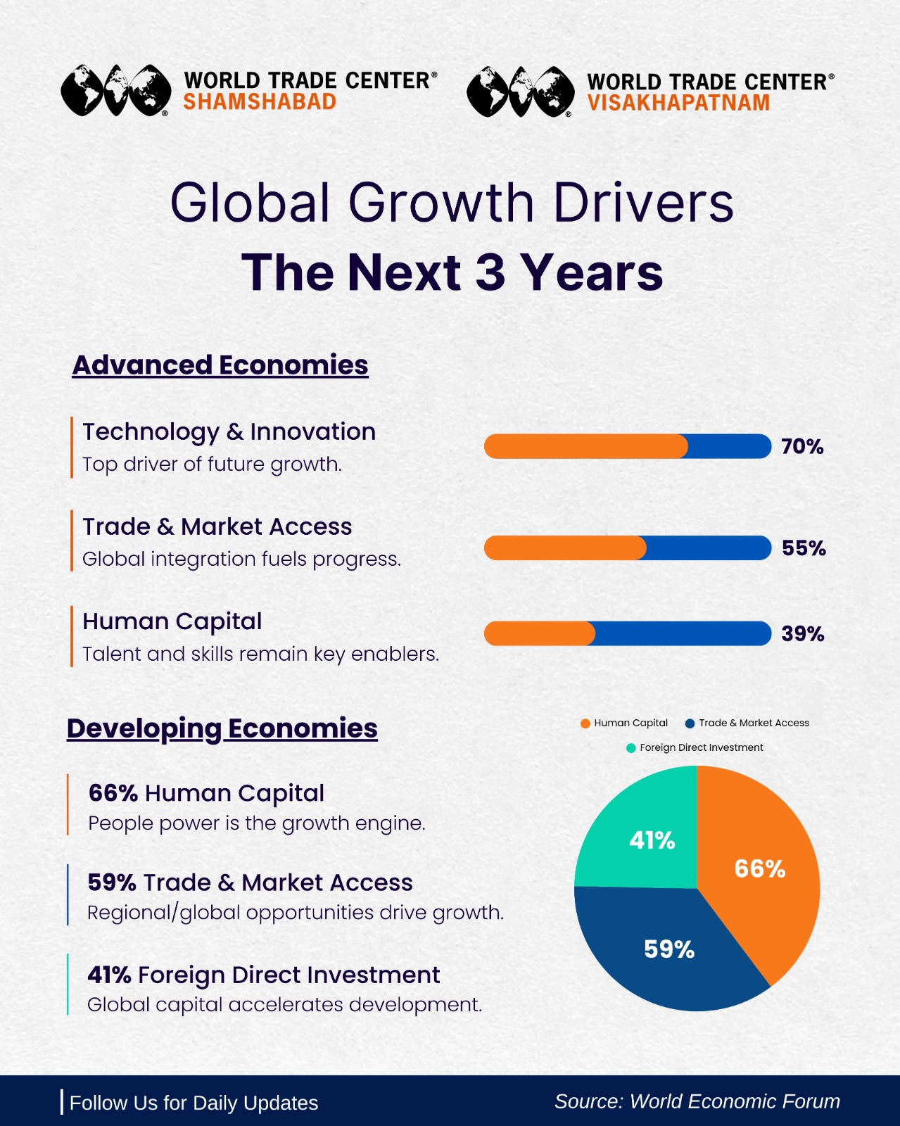 | | | The World Economic Forum’s 2025 outlook highlights the diverging yet complementary growth priorities of global economies. Advanced economies are set to rely heavily on technology and innovation (70%) as their leading growth driver, while developing economies emphasize human capital (66%) and trade access (59%) as key enablers. These findings underline a critical truth: sustainable global growth will depend on striking the right balance between innovation ecosystems, skilled talent, and open trade frameworks. | | |