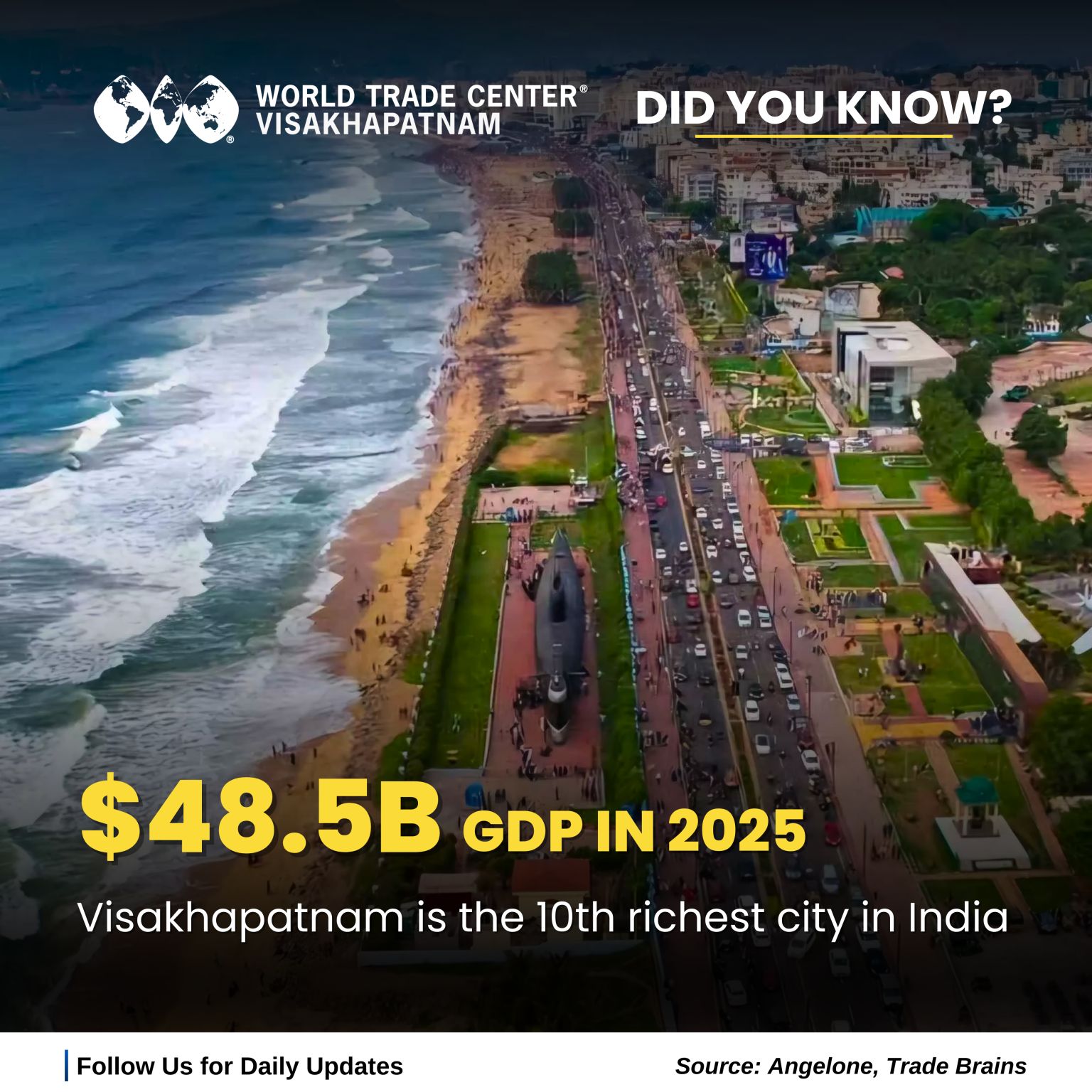 | | | With a GDP of $48.5 billion, Visakhapatnam proudly ranks 10th among India's top cities, driving the nation’s economic progress. The city supports the economy with its key industries of Steel, petrochemicals, education, and majorly port logistics, enhancing regional trade. Visakhapatnam isn’t just a coastal city — it’s a growing powerhouse contributing significantly to India’s development story. | | |