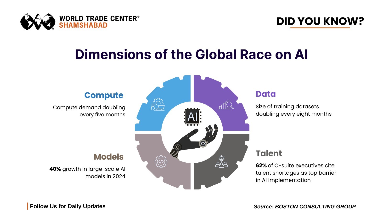 | | | The global race for AI leadership is intensifying across four critical dimensions — compute, data, models, and talent . According to Boston Consulting Group, compute demand is doubling every five months, training datasets are doubling every eight months, large-scale AI models grew by 40% in 2024 , and 62% of C-suite executives cite talent shortages as the top barrier to implementation.These dynamics highlight that the future of AI will be shaped not only by technology but also by the ecosystems built around it. | | |
